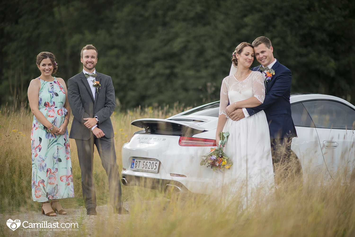 Turen gikk videre til Solli brug og Åsgårdselva hvor vi fotograferte resten av de oppstilte bildene, sammen med forlovere. Nydelig variasjon med skog, elv, kratt, stier og noen eldre bygg. Helt perfekt for en fotograf som ønsker å få til litt varierte bilder på ett og samme sted. Tilslutt, endte vi opp på Stensrød gård, hvor dem skulle fortsette festen sin. Jeg var med brudeparet i fire timer, og avsluttet dagen med et stort gruppebilde av alle gjestene, samt noen oppstilte med familie og venner.